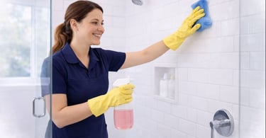 Cleaning and disinfecting toilets, sinks, showers, and bathtubs to prevent germs.